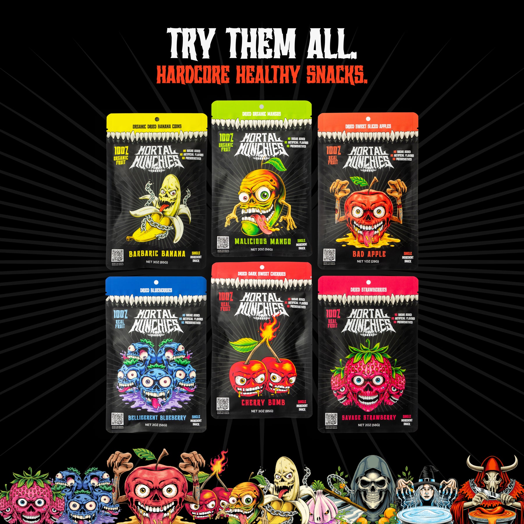 Forget labs and factories. Mortal Munchies is just nature, stripped down, and bagged for the journey. Our dried fruit—Bad Apples, Malicious Mangoes, Savage Strawberries—grows on trees, not in test tubes. We pluck it, dry it, and deliver it. No seed oils. No preservatives. No added sugar. Just pure, potent fuel that tastes as great as nature intended.