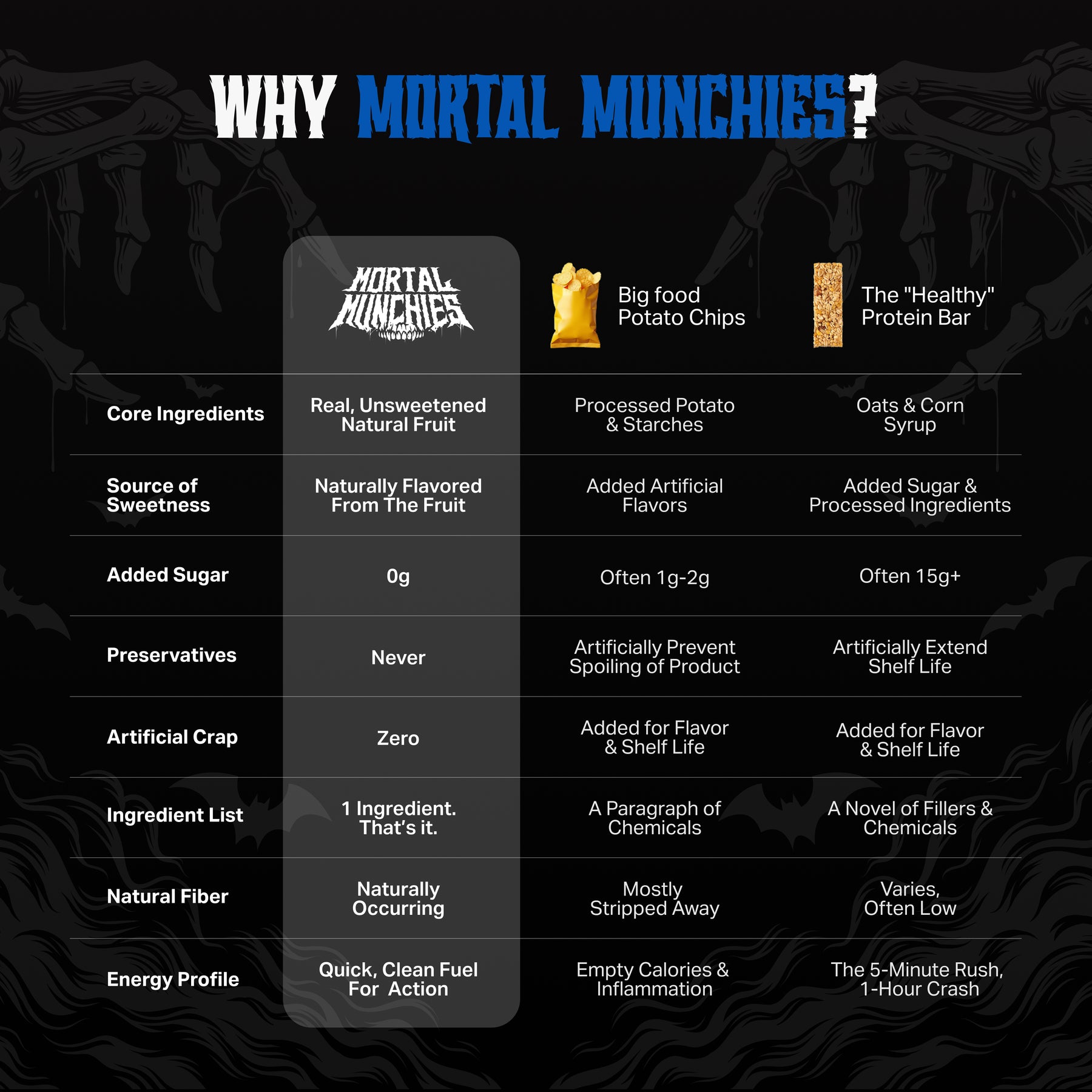 Mortal Munchies isn't just about snacks; it's a middle finger to the processed food industry pumping poison for profit. We're ingredient purists and B.S. detectors, hellbent on making healthy eating cool again. This is a movement for everyone tired of literally being fed lies. Are you ready to take back control?