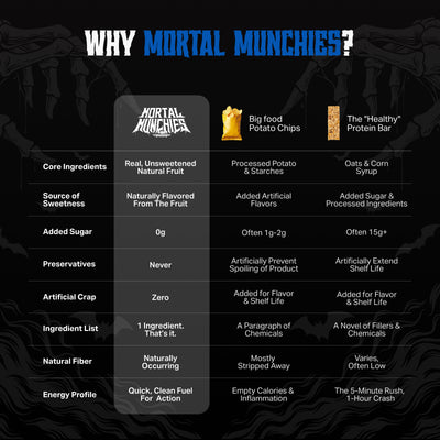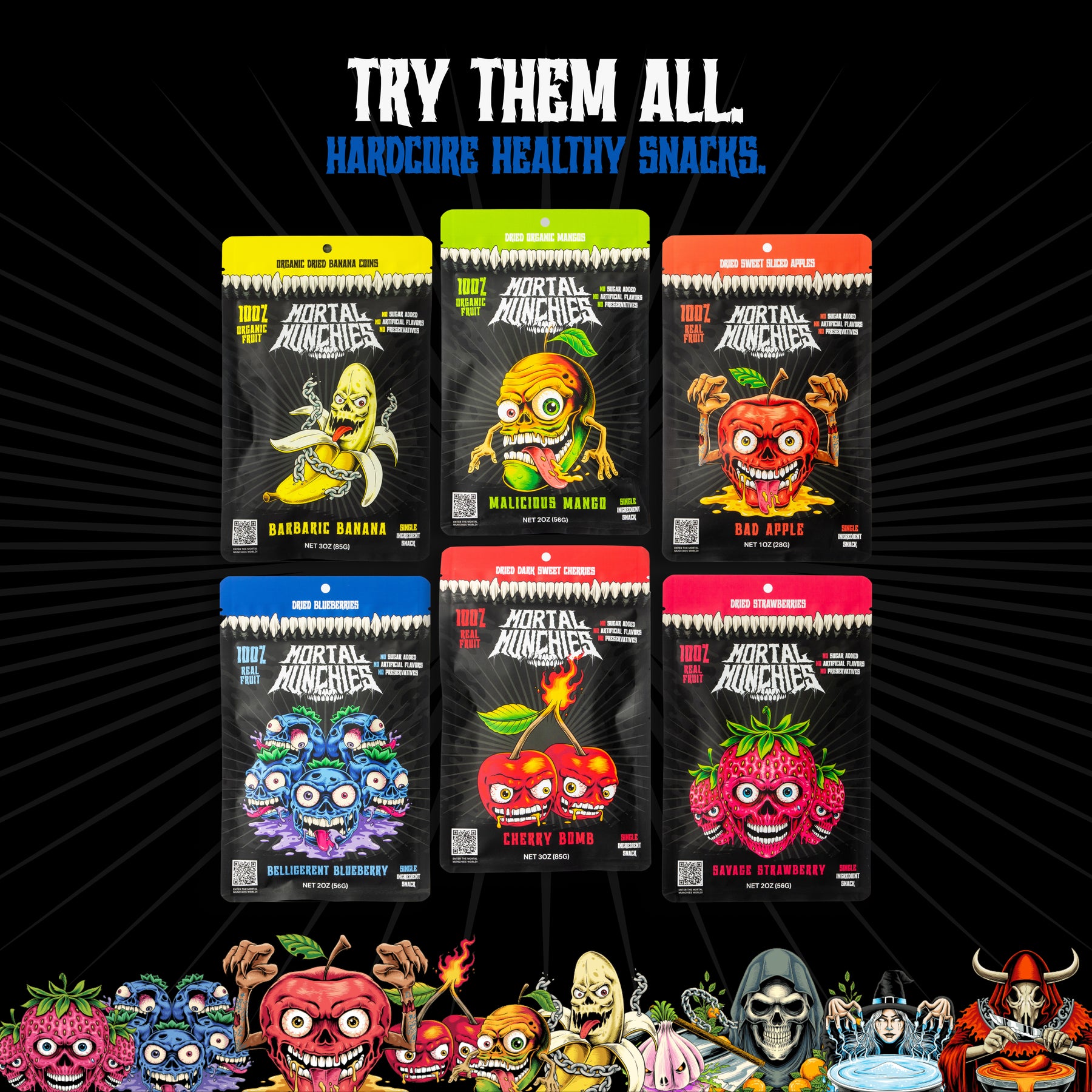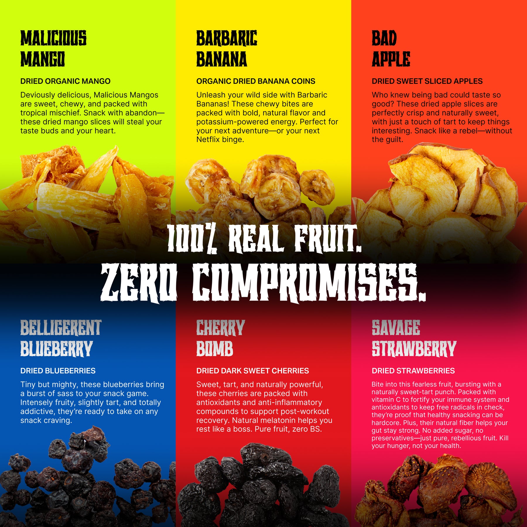 Forget labs and factories. Mortal Munchies is just nature, stripped down, and bagged for the journey. Our dried fruit—Bad Apples, Malicious Mangoes, Savage Strawberries—grows on trees, not in test tubes. We pluck it, dry it, and deliver it. No seed oils. No preservatives. No added sugar. Just pure, potent fuel that tastes as great as nature intended.