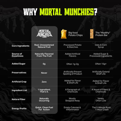 Mortal Munchies isn't just about snacks; it's a middle finger to the processed food industry pumping poison for profit. We're ingredient purists and B.S. detectors, hellbent on making healthy eating cool again. This is a movement for everyone tired of literally being fed lies. Are you ready to take back control?
