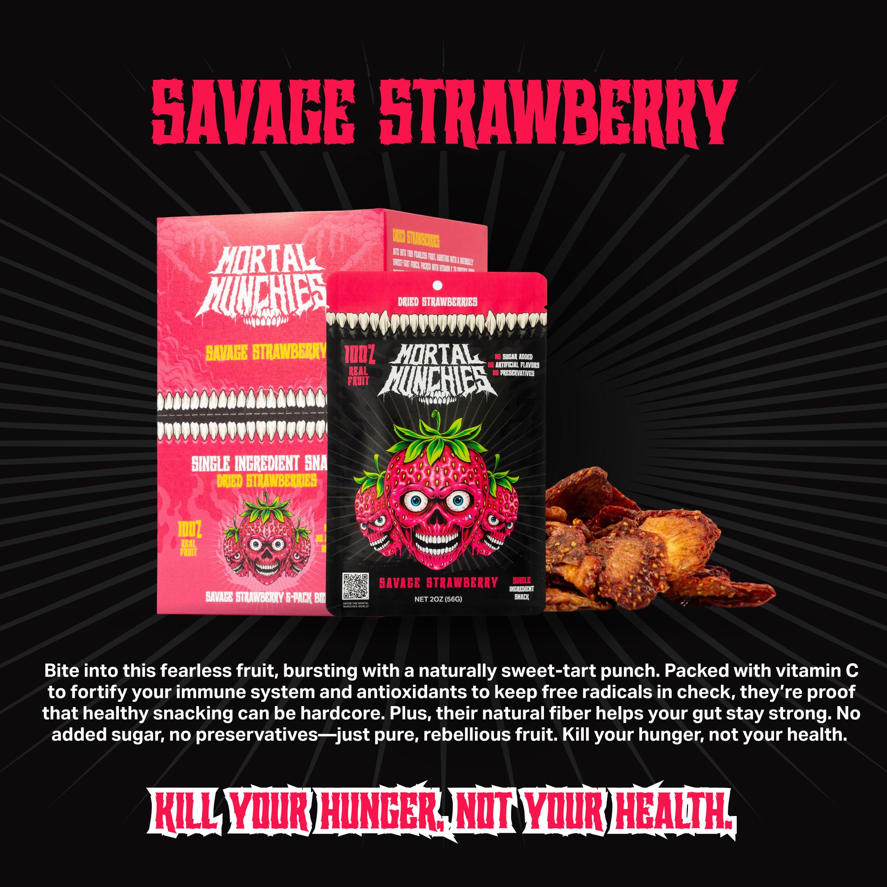 Forget labs and factories. Mortal Munchies is just nature, stripped down, and bagged for the journey. Our dried fruit—Bad Apples, Malicious Mangoes, Savage Strawberries—grows on trees, not in test tubes. We pluck it, dry it, and deliver it. No seed oils. No preservatives. No added sugar. Just pure, potent fuel that tastes as great as nature intended.